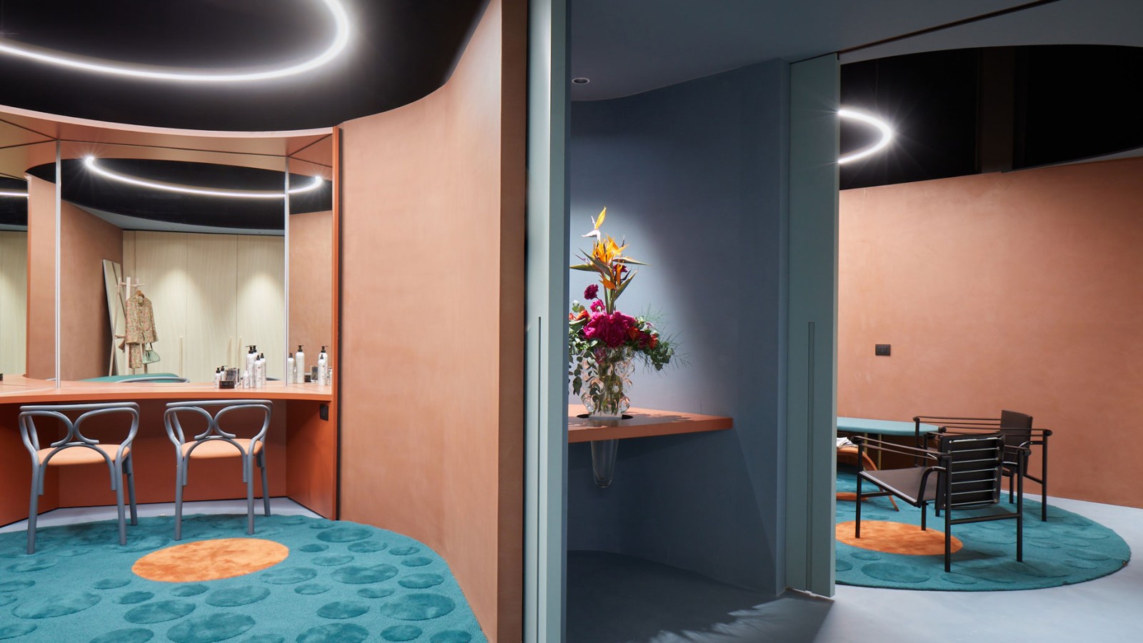 Après des discussions intensives avec les futurs utilisateurs des loges, les designers ont conçu une pièce semi-circulaire comprenant un espace de maquillage et de vie, une cuisine et une salle de bains privée. Des lignes douces et courbes dominent lʼesthétique et créent une ambiance détendue. Le concept de couleurs réussit habilement à transmettre de la sérénité avec un orange vif et un vert pétrole velouté.