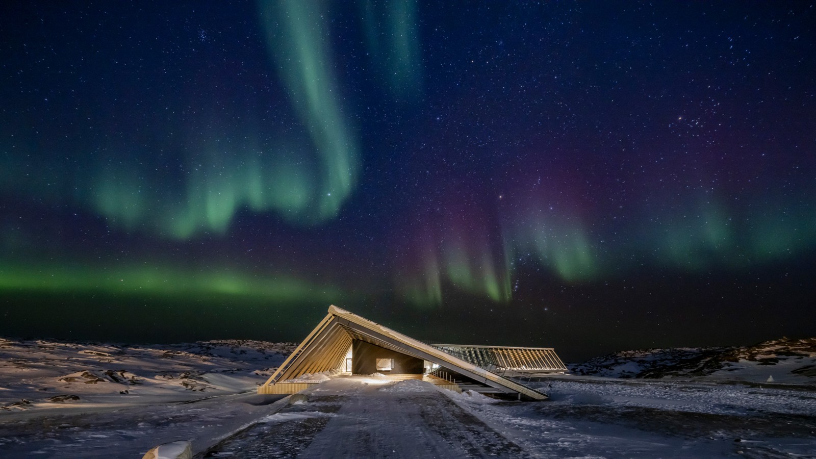Die Verletzlichkeit dieser Wildnis wird im Eisfjordzentrum des Architekten Dorte Mandrup in Ilulissat gespiegelt. Am Rande der drittgrösstem Stadt Grönlands auf einem Hochplateau errichtet, überblickt das Besucherzentrum nicht nur die spektakuläre Bucht mit den forttreibenden Eisbergen. Es fügt sich mit seiner Form eines Flügels in diese von Wind und Schnee verwehte Landschaft ein.